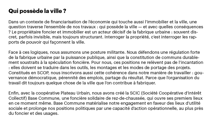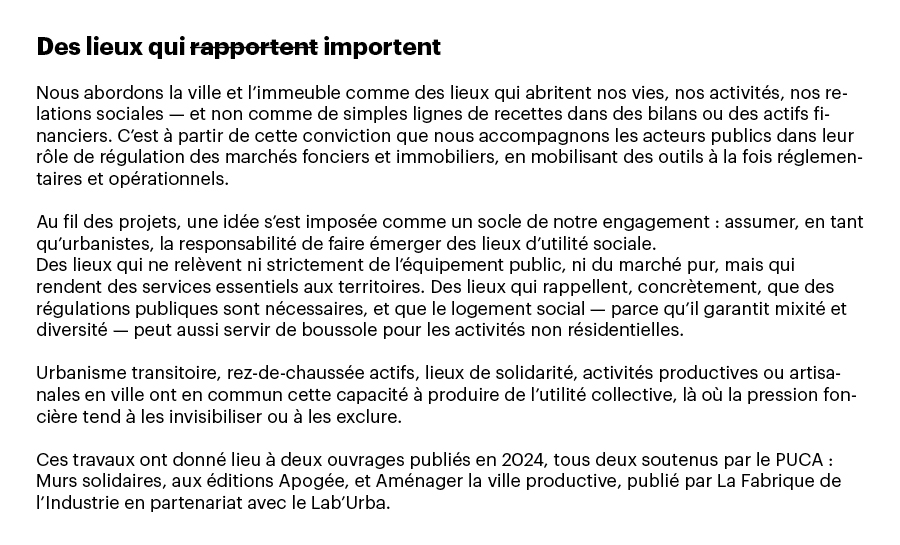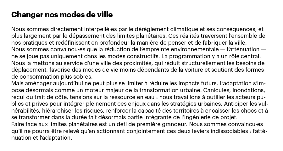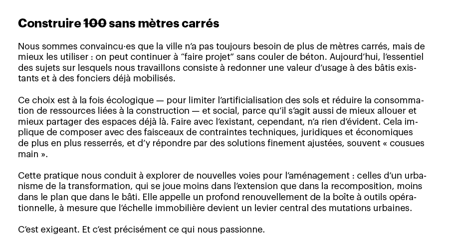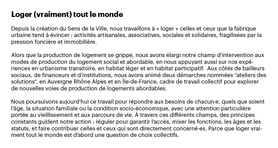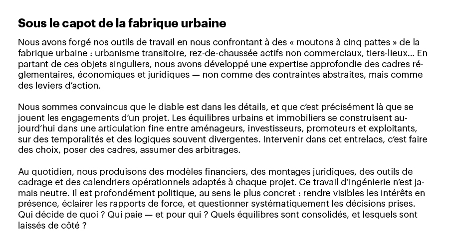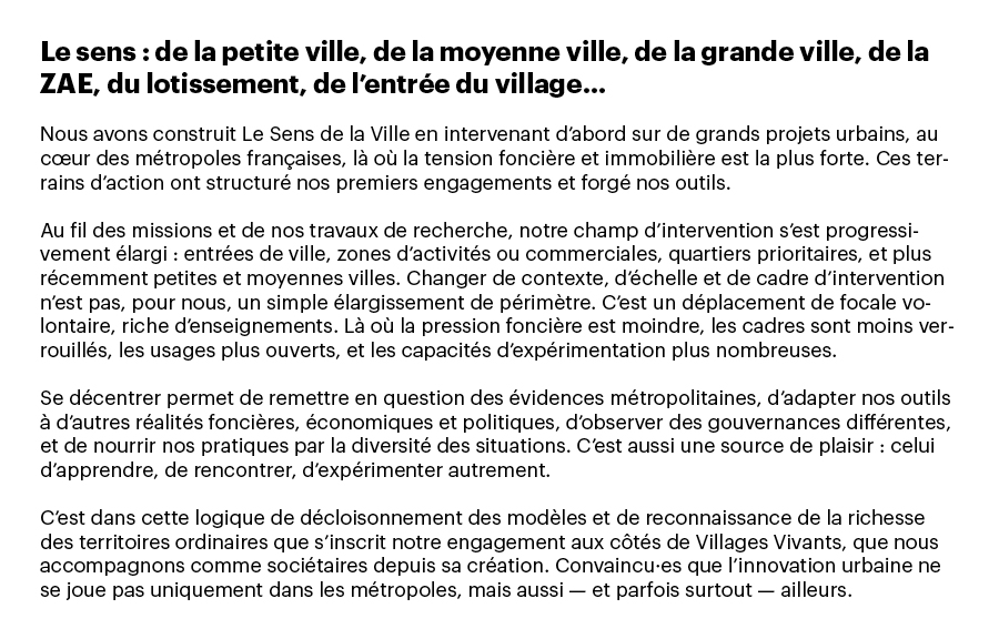 Quand nous avons créé Le Sens de la Ville, en 2015, une question s’est imposée à nous, urbanistes : à quelle ville voulons-nous contribuer désormais ? 2015, c’était à la fois Réinventer Paris et les Grands Voisins : deux visions contrastées de la fabrique urbaine, mais un même déplacement décisif — remettre l’usage et les manières d’habiter au centre du projet.