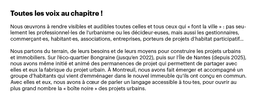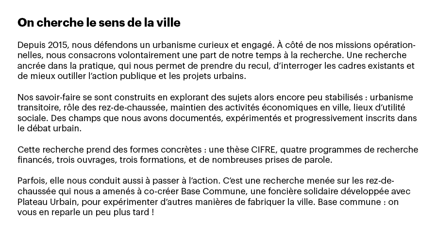 Or, nous avions justement créé Le Sens de la Ville à partir d’une conviction simple et forte : remettre l’usager au cœur de la fabrique urbaine et avoir ainsi davantage de considération pour son espace-temps. Cela implique de considérer le temps court — et donc l’urbanisme transitoire —, l’échelle du piéton — et donc des rez-de-chaussée actifs —, mais aussi des lieux intensifs en usages et souvent pauvres en ressources, tels que les communs et les espaces d’utilité sociale. En cherchant à dépasser une production de la ville trop technocratique, nous avons voulu inscrire ces enjeux d’usages à l’agenda d’une fabrique urbaine qui se construit autant par les pratiques que par les plans.