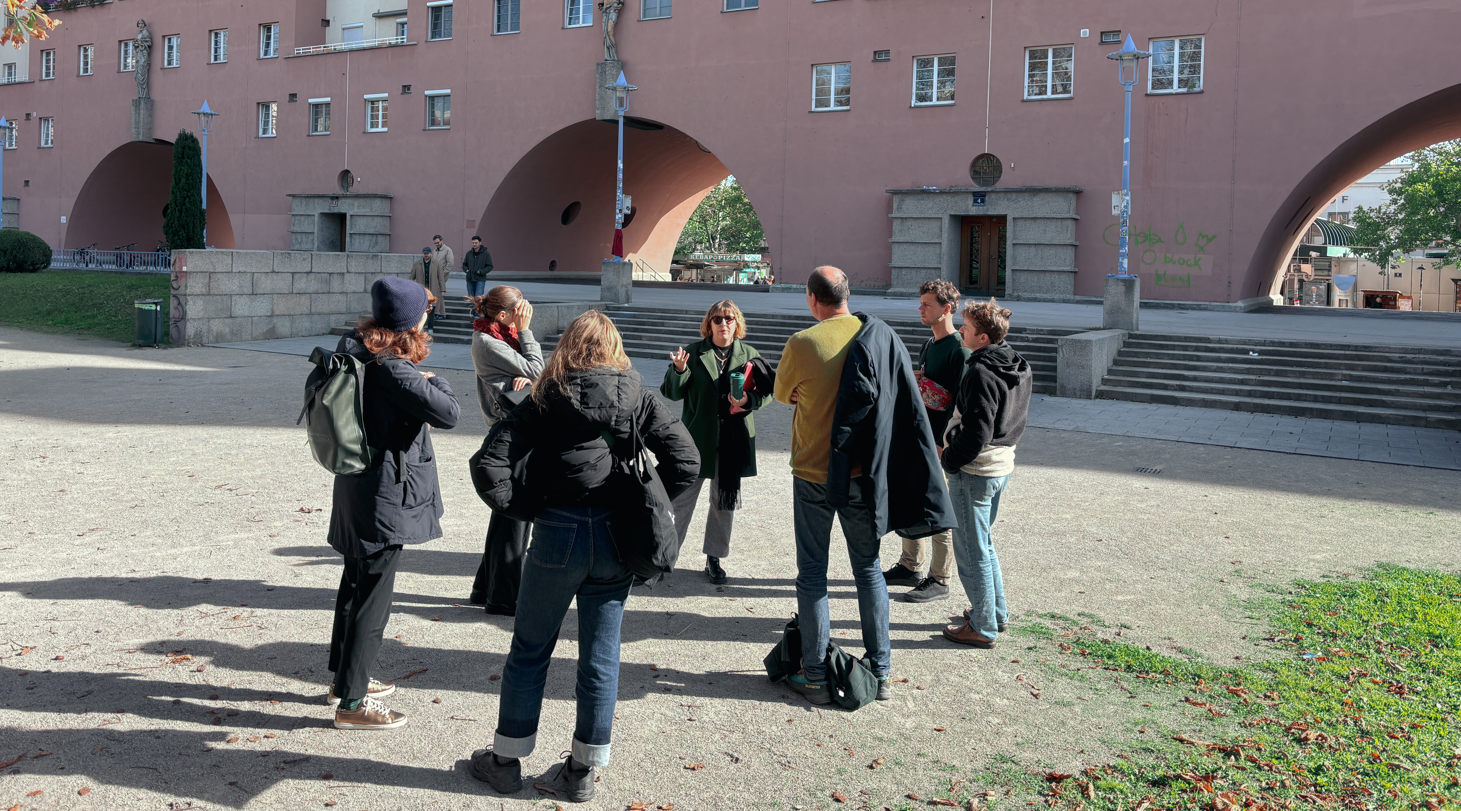 Cet héritage est ancré dans la mythologie de « Vienne la rouge », un surnom tiré de l’ambitieuse politique de construction de logements sociaux portée par le parti social démocrate de 1918 à 1934. Nous nous sommes immédiatement mis dans le bain en débutant ce périple par la visite de l'immeuble le plus emblématique de cette période : le Karl-Marx-Hof, conçu comme un « palais du prolétariat », avec une statue en bronze à la gloire des travailleurs et travailleuses trônant au milieu du parc. L’ensemble du complexe s'étire sur 1,1 km et comptait à son inauguration environ 5000 habitant·es pour 1000 logements.