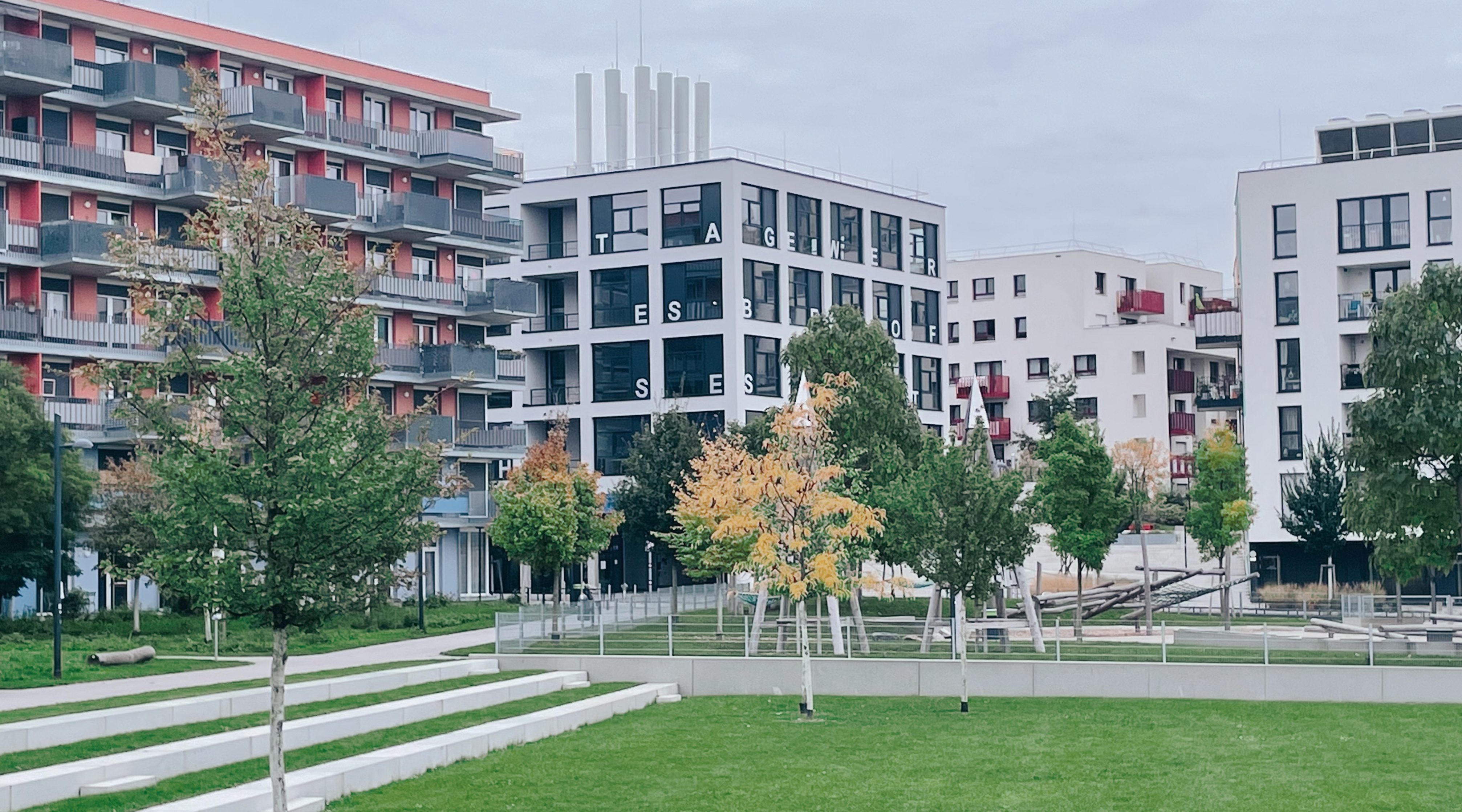La visite, guidée par Sebastian Zenz de la société Wien 3420 AG, a commencé dans un immeuble étonnant : un parking furtif dont la façade est constituée d’un mur où se logent un café et quelques bureaux. Sur le toit, des terrains de foot - et en sous-sol, une salle d’escalade. La mixité programmatique est la pierre angulaire du projet qui continue de se développer. Un projet d’habitat collaboratif est planifié pour chaque quartier. La ville productive côtoie les logements avec un hôtel d’entreprise, tandis que les industries plus lourdes sont situées plus en périphérie. Le trafic routier est concentré sur une grande voie en rocade et des petites dessertes intra-quartiers. Ici, pas de shopping mall, mais des allées commerciales dont les rez-de-chaussée sont gérés par un opérateur unique qui sous-loue à des commerçants sélectionnés selon les besoins. Et un immense groupe scolaire dont le parc s’ouvre aux habitant·es le week-end, face à une parcelle où est prévu un centre cultuel rassemblant 10 religions.
